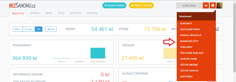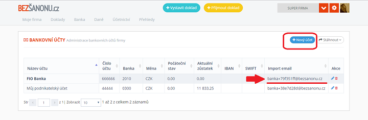 Zpracování bankovních pohybů prostřednictvím e-mailu je mnohem jednodušší. V bezsanonu.cz v Nastavení, Bankovní účty si založíme bankovní účet a systém nám vygeneruje e-mail, který potom zadáme do internetového bankovnictví.
