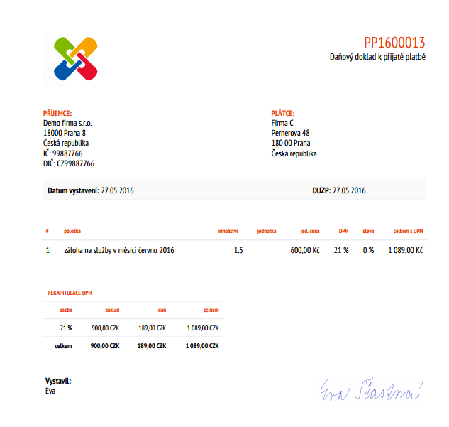 Po vytištění nebo stažení máme k dispozici daňový doklad k přijaté platbě. Více o daňových dokladech se můžete dočíst zde https://www.bezsanonu.cz/doklady/zakladni-nazvy-dokladu.html