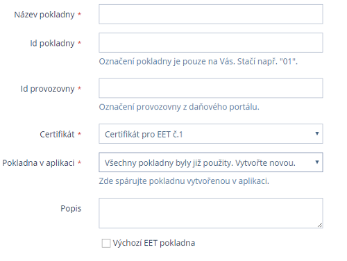Nakonec nám zbývá vytvořit EET pokladnu nebo pokladny, záleží na naší firmě a provozech.