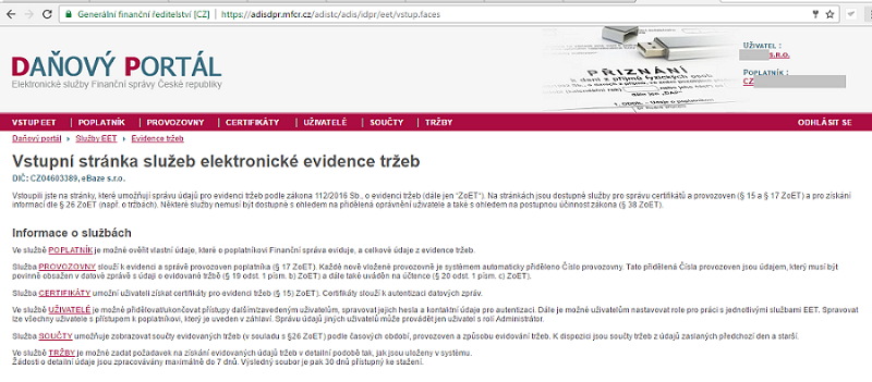 Na vstupní stránce získáme informace o službách, jako jsou poplatník, provozovny, certifikáty, uživatelé, součty a tržby.